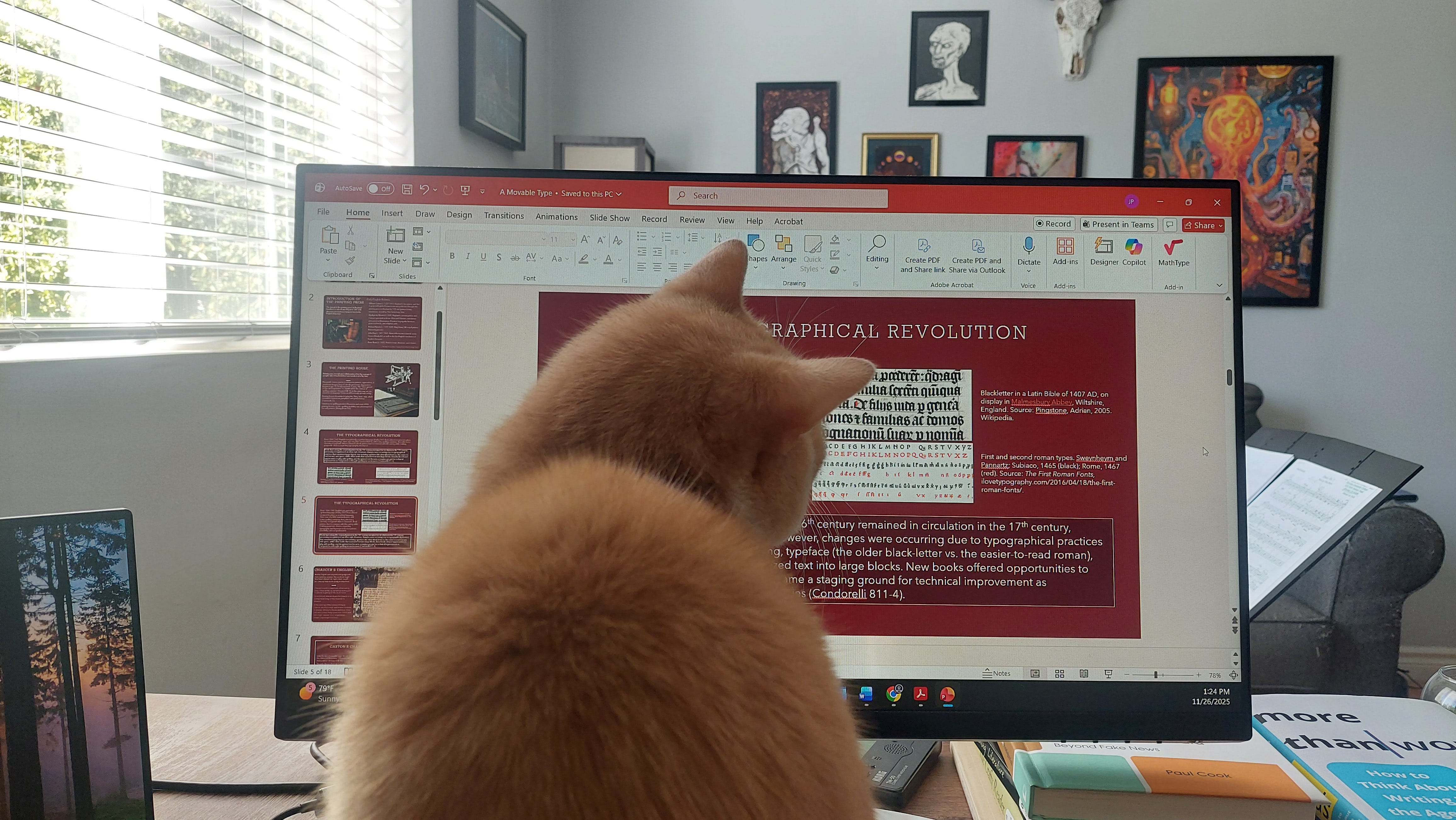 One out of one cats agree it’s the best PowerPoint they’ve ever seen. Funny, because it’s about the influence of the printing press on English orthography, and I’m pretty sure cats can’t read. (catch a glimpse of More Than Words hanging out on my desk)
