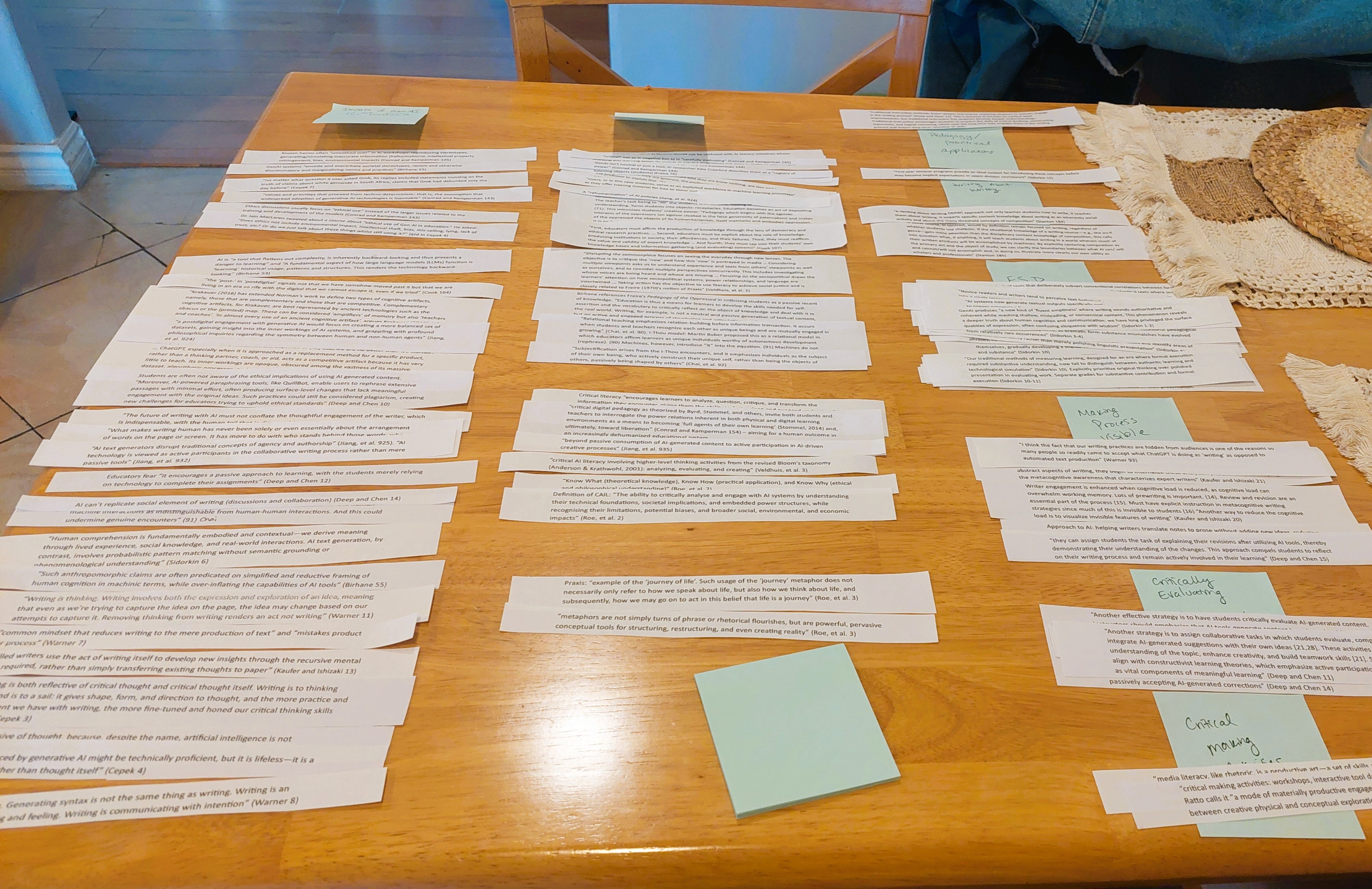 Much of my recent writing work has been related to research rather than fiction. I’m taking an online graduate certificate right now in Literature & Language as part of my sabbatical, and now that it’s research paper season again, I get to be on the student side of things for a change. Yes, it’s more fun (for me—I’m a weirdo) to do research projects than it is to grade them. My big project is about Critical AI Literacy in first year composition. Part of the paper discusses making the writing process visible, as it is so often obscured, especially for students. So in the interest of practicing what I preach, here I am making my process visible at the kitchen table: